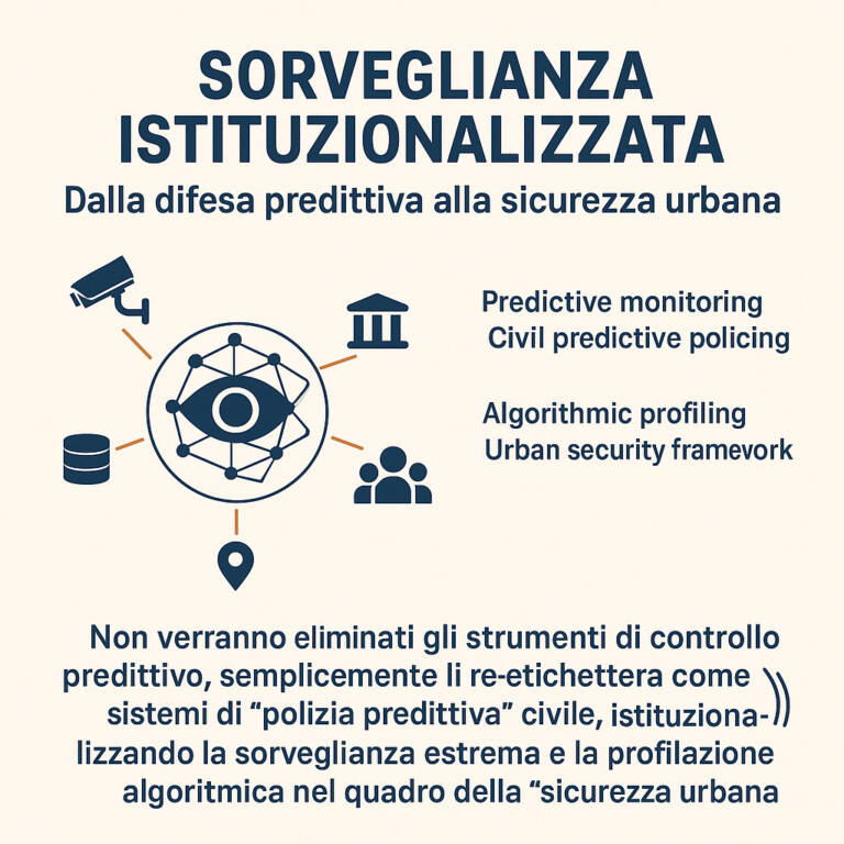 I piani di pace in corso per la Striscia di Gaza pongono requisiti stringenti, con un mandato primario che prevede la smilitarizzazione totale e la supervisione di una forza internazionale di stabilizzazione (FIS) temporanea, incaricata di addestrare e istituire una forza di polizia palestinese autoctona. Tuttavia, la stabilizzazione post-conflitto dipende, secondo questi piani, da una struttura di comando, controllo, comunicazione e informazione (C4I) che la nuova forza di polizia non sarà comunque in grado di possedere. In poche parole , la eventuale nuova polizia palestinese sarà costretta a operare in un ambiente dove gli strumenti di sorveglianza avanzata — CCTV, droni, database biometrici — sono indispensabili ma impiantati e gestiti da attori esterni, i veri protagonisti del controllo. Se l’infrastruttura di sorveglianza e i dati rimarranno sotto il controllo tecnologico di entità esterne, la polizia locale verrebbe ridotta a un braccio esecutivo di un sistema di profilazione locato altrove, minandone la legittimità fin dal suo insediamento. Questa dipendenza si lega a una transizione ancora più problematica: il passaggio dal Diritto Internazionale Umanitario (IHL) al Diritto Internazionale dei Diritti Umani (IHRL). La rapida integrazione di IA e robotica ha già trasformato la guerra, ma nella fase post-bellica, le stesse tecnologie militari usate per il targeting (come Lavender) o per le restrizioni di movimento (come Red Wolf) verranno riclassificate come strumenti di polizia. Il passaggio da IHL a IHRL non eliminerà gli strumenti di controllo predittivo, semplicemente li re-etichetterà come sistemi di “polizia predittiva” civile, istituzionalizzando la sorveglianza estrema e la profilazione algoritmica nel quadro della “sicurezza urbana”.