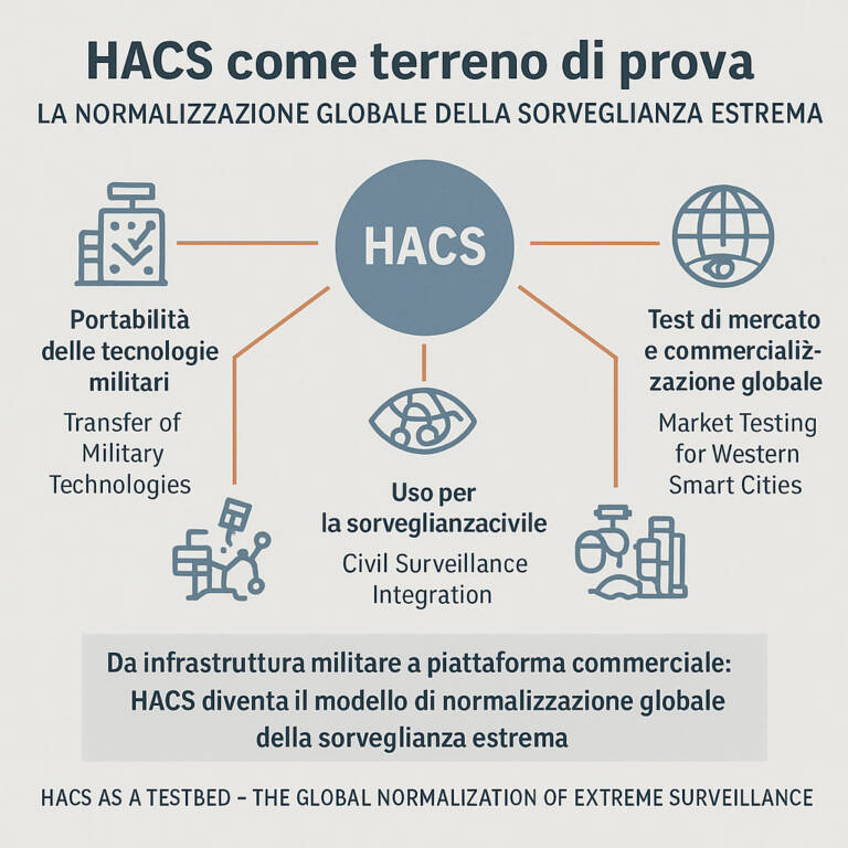 Tale sistema, definito sistema ibrido di controllo automatizzato (HACS), non sarebbe costruito ex novo, ma deriverebbe dalla rapida riconversione delle infrastrutture e dei database militari preesistenti. Questo modello servirebbe poi da progetto pilota per l’esportazione globale sui mercati della sicurezza metropolitana e nazionale. La dinamica dell’industria della difesa, che utilizza il territorio come un “terreno di prova” per trasformare le tecnologie di urban warfare in “soluzioni per la sicurezza urbana” (Homeland Security – HLS), creerebbe con Gaza un pacchetto di controllo altamente commercializzabile, la cui diffusione comporterebbe la normalizzazione internazionale di pratiche di sorveglianza estrema e l’erosione della sovranità dei dati civili.