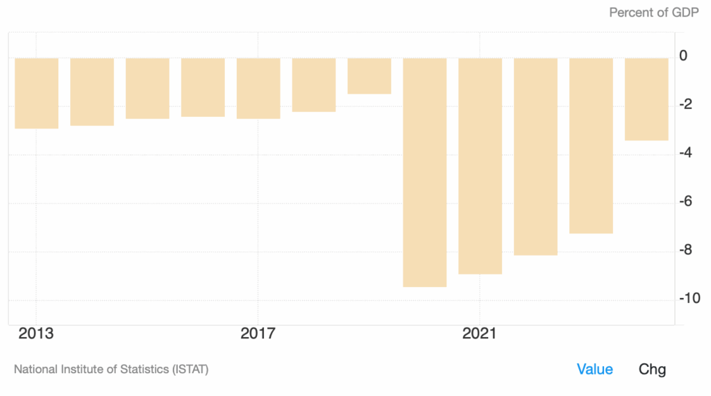 Rapporto deficit/PIL italiano tra il 2013 e il 2024.