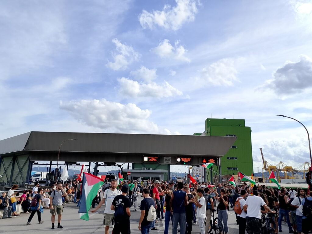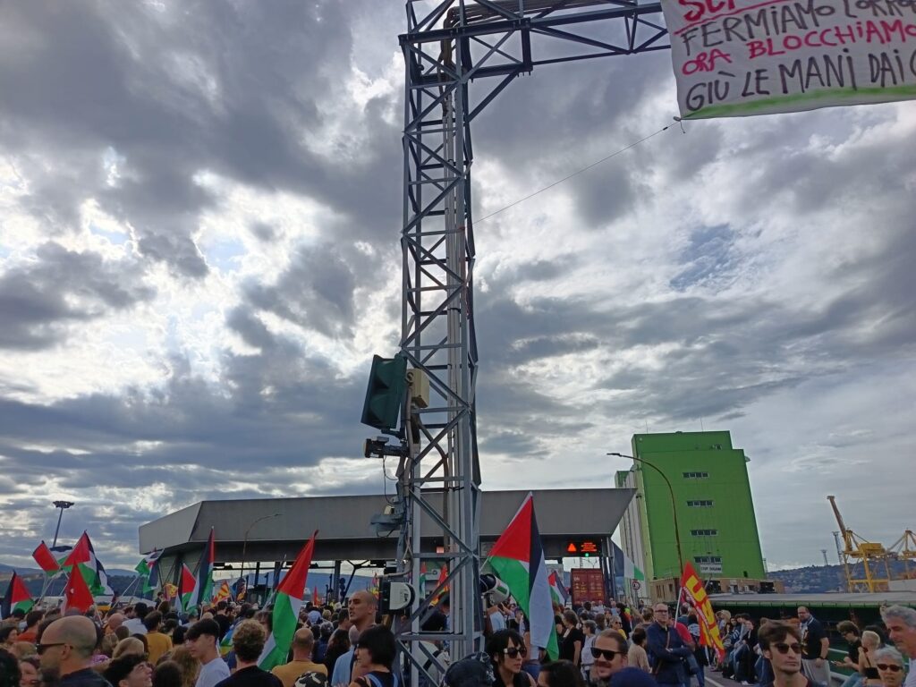 Diverse migliaia di persone si sono adunate al varco IV per il blocco del Porto di Trieste. Numerosi i portuali che hanno aderito allo sciopero con la richiesta determinata di un embargo totale a Israele e la fine del traffico di armi attraverso il porto di Trieste.