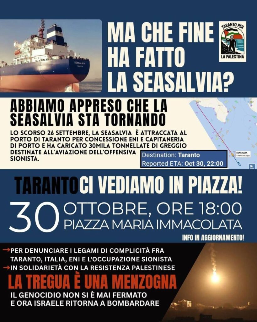La SeaSalvia, con la complicità dell’ autorità portuale di Taranto, dell’Eni e dell’amministrazione comunale, ha già attraccato in passato per poi dirigersi verso le acque palestinesi, trasportando 30.000 tonnellate di greggio a sostegno della violenza coloniale dell’aviazione sionista.