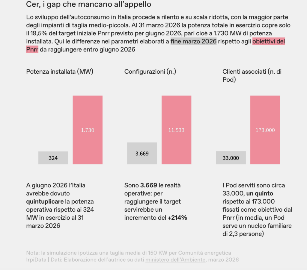 Le comunità hanno quindi avuto tempi strettissimi per progettare gli interventi e sperare di realizzarli in tempo. L’obiettivo iniziale, da Pnrr, era installare entro giugno 2026 1730 MW di potenza tramite nuovi impianti, pena il mancato sblocco della tranche.