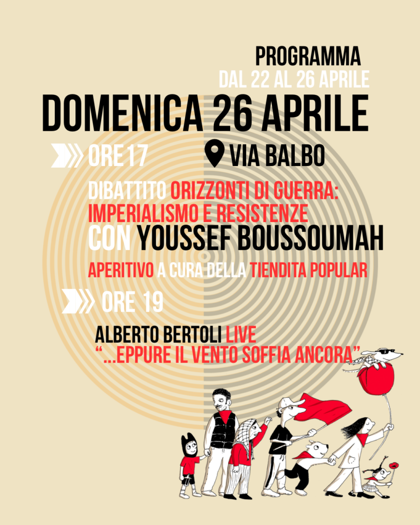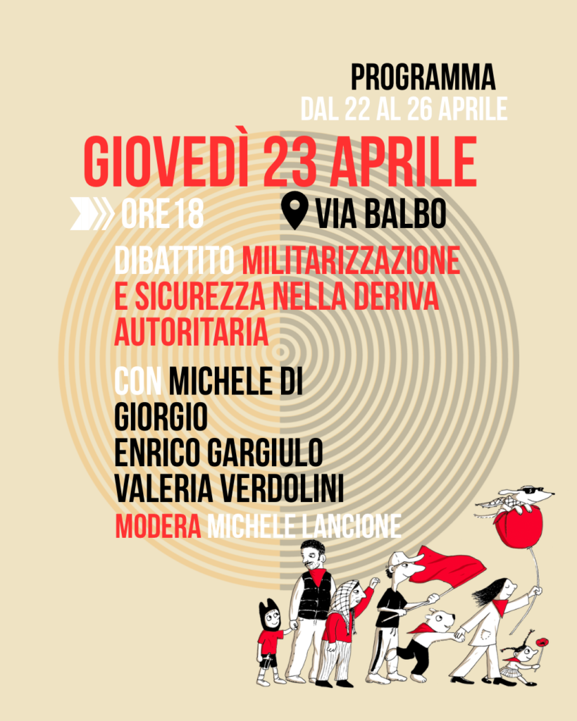 La quarta edizione del festival avrà l’ambizione di essere una tappa di questo percorso collettivo dal nome “Torino Partigiana” affinché possa essere un momento di incontro e ragionamento collettivo a partire dai temi sui quali ci interroghiamo nelle nostre vite: la militarizzazione e la sicurezza nella deriva autoritaria ma anche le forme di resistenza e le esperienze di opposizione a tutto questo; la guerra come paradigma globale per la fuoriuscita dalla crisi dell’Occidente e i mezzi sempre più raffinati di cui si dota, ma anche le resistenze che indicano una via praticabile per tutti e tutte; le storie di difesa dei territori dalle contraddizioni globali come quella energetica ed ecologica.