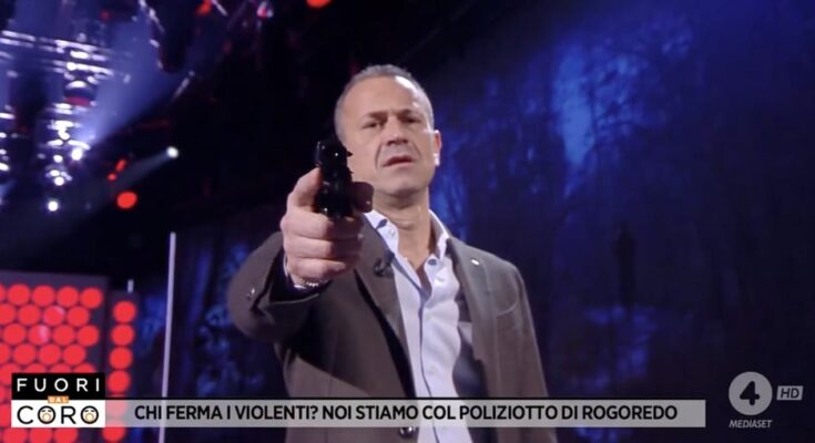 Uno studio illuminato, il pubblico a casa, il clima carico. Un sindacalista di polizia che estrae un’arma e la punta simbolicamente contro chi guarda. Non per minacciare davvero, ma per “dimostrare”. Per spiegare cosa si prova. Per orientare l’emozione.