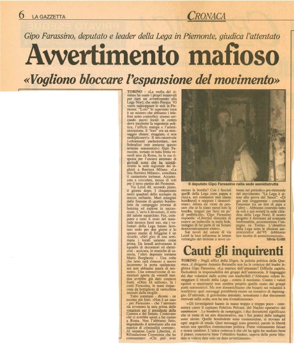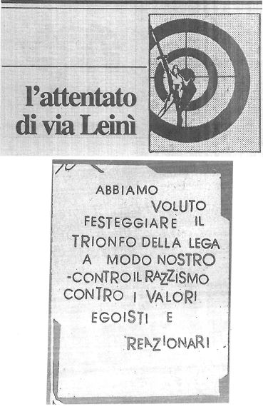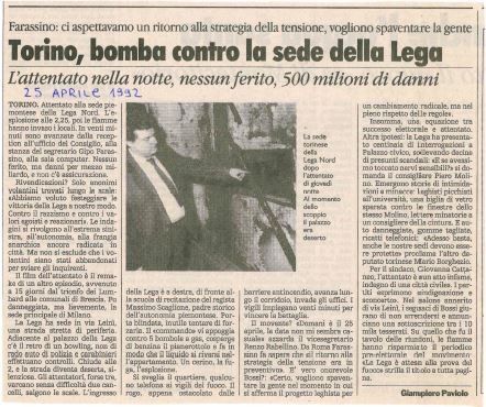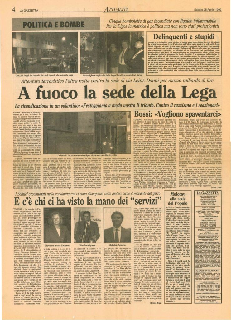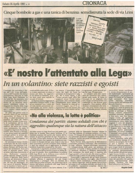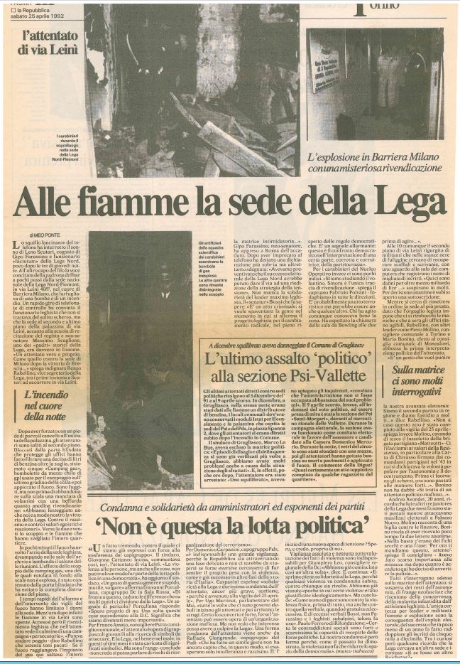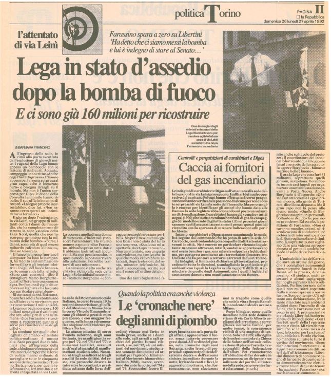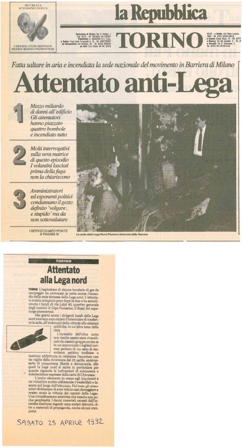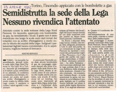 Verso le due del 24 aprile 1992 compagni autonomi festeggiano il 25 aprile dando fuoco alla sede della Lega Nord in Via Leinì, in piena Barriera di Milano a Torino.