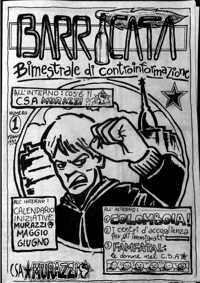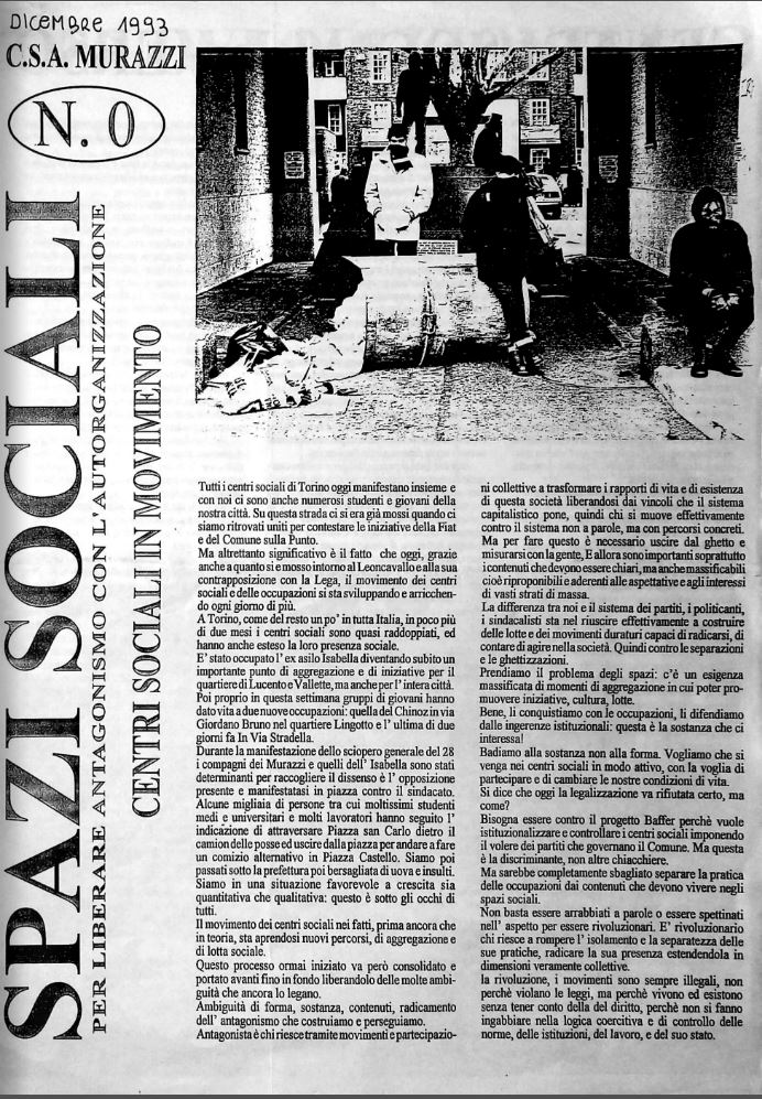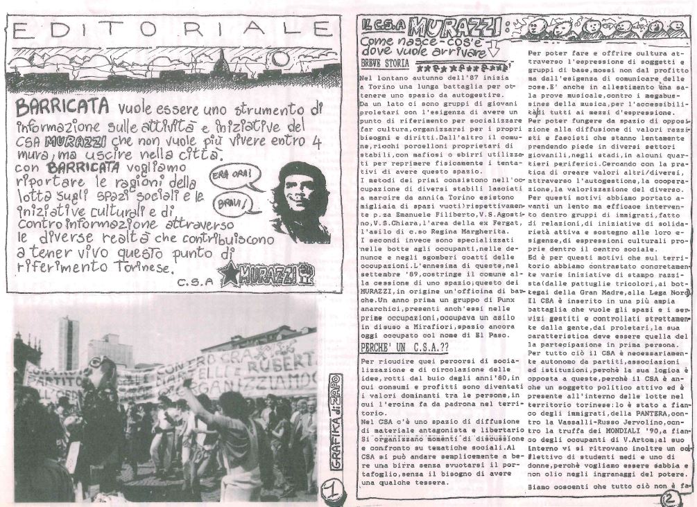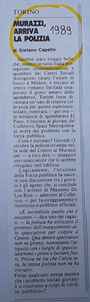 A Torino negli anni 87/88 erano avvenute ben cinque occupazioni, da parte del Collettivo Spazi Metropolitani, sempre represse con sgomberi e centinaia di denunce con l’occupazione del 9 settembre 1989 di un ex asilo in Corso Regina 47. Questo spazio era già stato sgomberato nel dicembre 87 ma da lì era partita una trattativa con il Comune fallita per le false promesse. In cambio dell’abbandono dello spazio occupato l’assessore competente ci propone diverse soluzioni: noi privilegiamo un luogo in una zona centrale di Torino. Il posto che ci siamo conquistati si trovava ai Murazzi del Po, era un ex officina nautica chiusa da anni. In quegli anni ai Murazzi vi era solo un locale “Giancarlo”, il Lungo Po d’estate era punto di ritrovo per centinaia di giovani ma nell’ultimo periodo spaccio di droga e retate della polizia l’avevano resa un deserto. La prima festa fu organizzata per il 30 settembre. Fin da subito sono partiti, oltre i lavori, iniziative e concerti: i primi due concerti organizzati al Csa erano intitolati “siamo incazzati neri” e “né eroina né polizia”. L’impegno dei compagni e delle compagne ha permesso che in breve tempo si trasformasse in un luogo vivo e pieno di iniziative, nonostante le provocazioni poliziesche in cui un compagno venne arrestato per resistenza. Fu organizzato un corteo cittadino contro la legge Russo/Iervolino sulle droghe e una mobilitazione per il compagno Guido Borio che nel frattempo era stato riarrestato per la condanna a 26 anni. Dopo aver conquistato questo spazio scrivevamo: “Questo percorso ci ha insegnato che la lotta paga, che la determinazione vale sovente molto di più di centinaia di raccolte firme e di pellegrinaggi all’assessorato. E questo in una fase di “nuovi modi di far politica “, quelli delle catenelle umane e della spettacolarità delle iniziative e se li si fa, le lotte, solo di contorno, vuol dire molto. Ci ha insegnato che quando, da buoni marxisti, si vive nella materialità delle lotte, si sa amministrare il proprio bagaglio di esperienze, si sa ragionare sui passaggi tattici da fare, alla fine quello che hai seminato con tanta fatica (anche se noi cerchiamo di farne il meno possibile) darà i suoi frutti”.