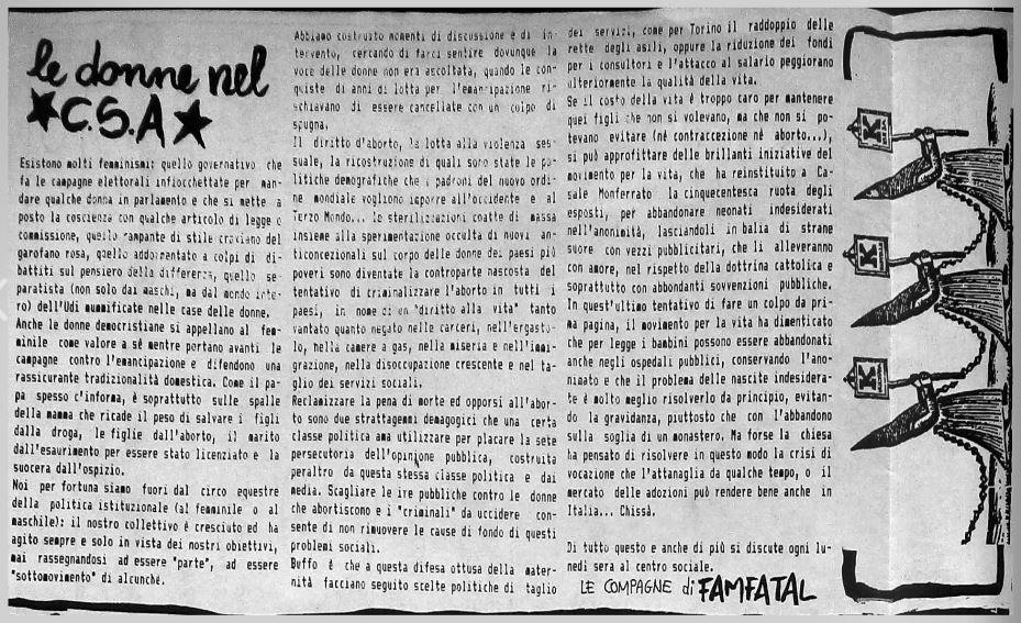 Insomma pur tra contraddizioni e difficoltà, credo che il CSA sia stato un soggetto vivace e conflittuale in quella Torino di quegli anni per la gran parte spenta e pacificata, e sia stato anche tra i pionieri e propulsori di quel movimento delle occupazioni torinese che si svilupperà negli anni seguenti.