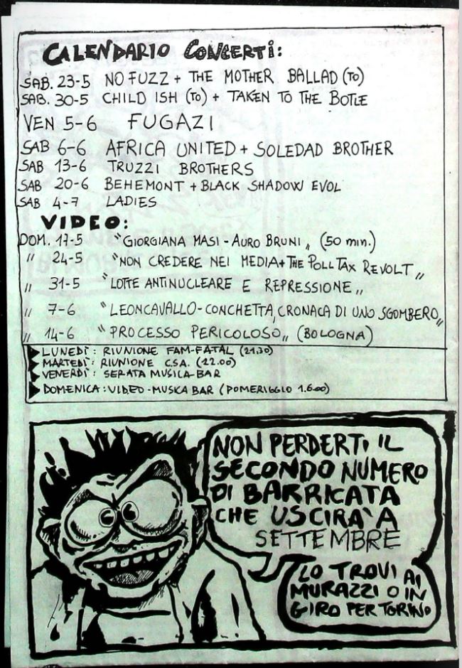 A Torino la scena musicale legata al C.S.A. in quegli anni era molto attiva; tanti sono stati i gruppi, divenuti in seguito anche famosi, cresciuti ai Murazzi che hanno sostenuto il centro sociale con concerti.