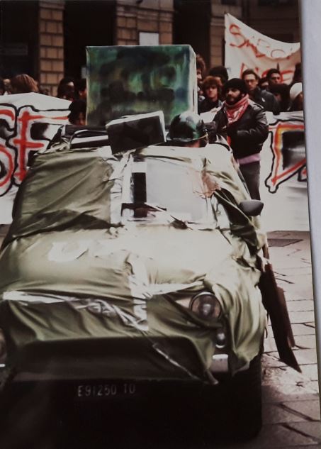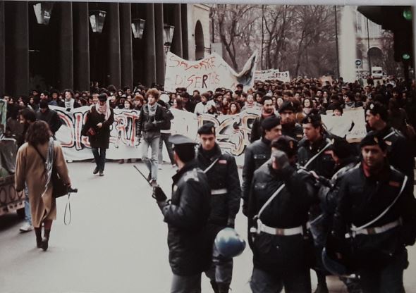 Ne ricordo una in particolare, un grosso corteo studentesco che finì in piazza castello. Per la prima volta vidi una parte di piazza ed uno spezzone particolarmente rumoroso e determinato. C’era un grande striscione contro gli USA di Reagan (se ricordo bene avevano da poco bombardato in Libia). Volarono un po’ di uova di vernice e qualche fumogeno colorato verso la polizia… rimasi subito colpito favorevolmente dall’aria che si respirava.
