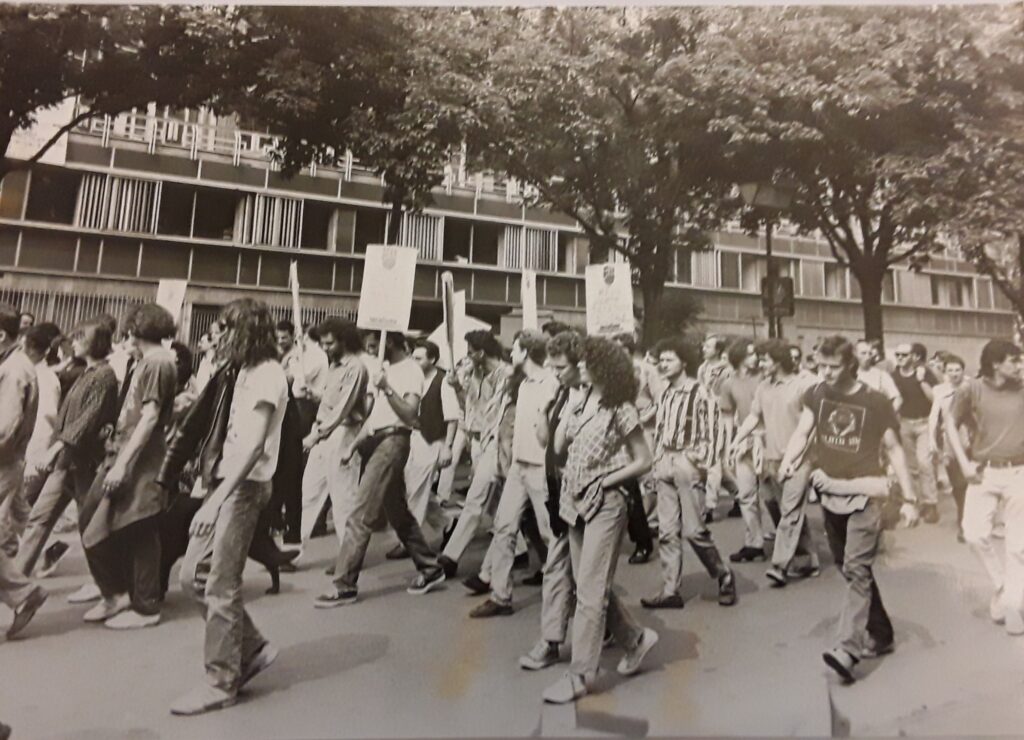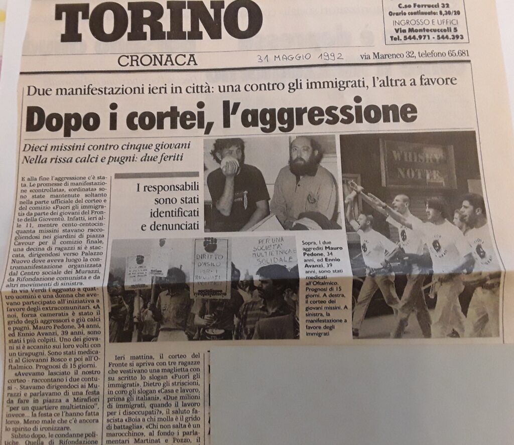Con l’evidente sgretolarsi della classe politica dell’epoca, travolta dagli scandali legati alle tangenti di quei primi anni Novanta, le manifestazioni di protesta furono sempre più partecipate e consapevoli. A Torino le azioni del centro sociale seppero acquisire incisività: ricordo con piacere il corteo organizzato dal collettivo studentesco K.S.A. cui parteciparono più di 20.000 studenti che sfociò con l’occupazione della stazione di Porta Nuova (azione all’epoca per nulla scontata).