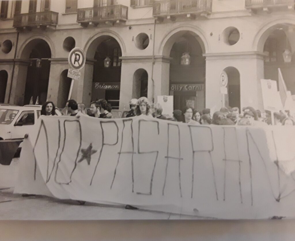 Ebbi la percezione di appartenere a qualcosa di ben radicato, di altre iniziative che ricordo fuori città furono un’iniziativa vicino all’ACNA di Cengio dove per la prima volta subii una carica ben decisa di celere.