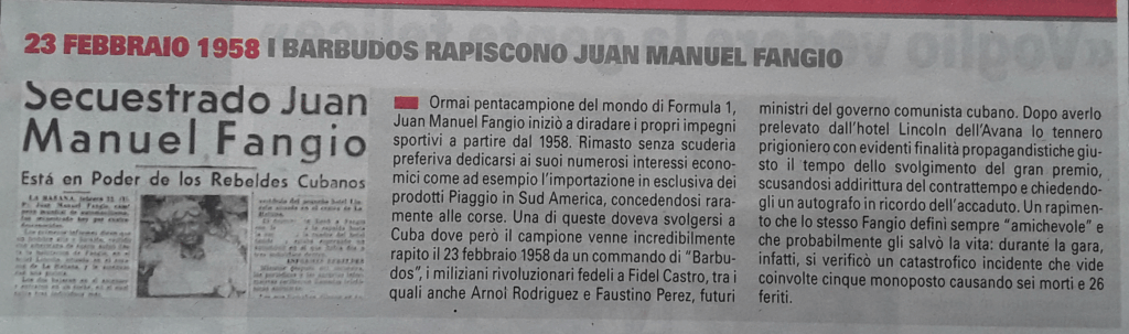 Juan Manuel Fangio, il pluricampione della Formula 1, il 23 febbraio 1958, si trova a Cuba per disputare il Gran Premio dell’Havana, che aveva già vinto l’anno precedente. L’argentino si trova nell’Hotel Lincoln e sta parlando insieme ad alcune persone quando Manuel Uziel gli si avvicina puntandogli una pistola addosso: “Signor Fangio. Sono del Movimento 26 luglio, deve venire con me. Non mi obblighi a sparare e mi segua” sono le poche parole pronunciate.