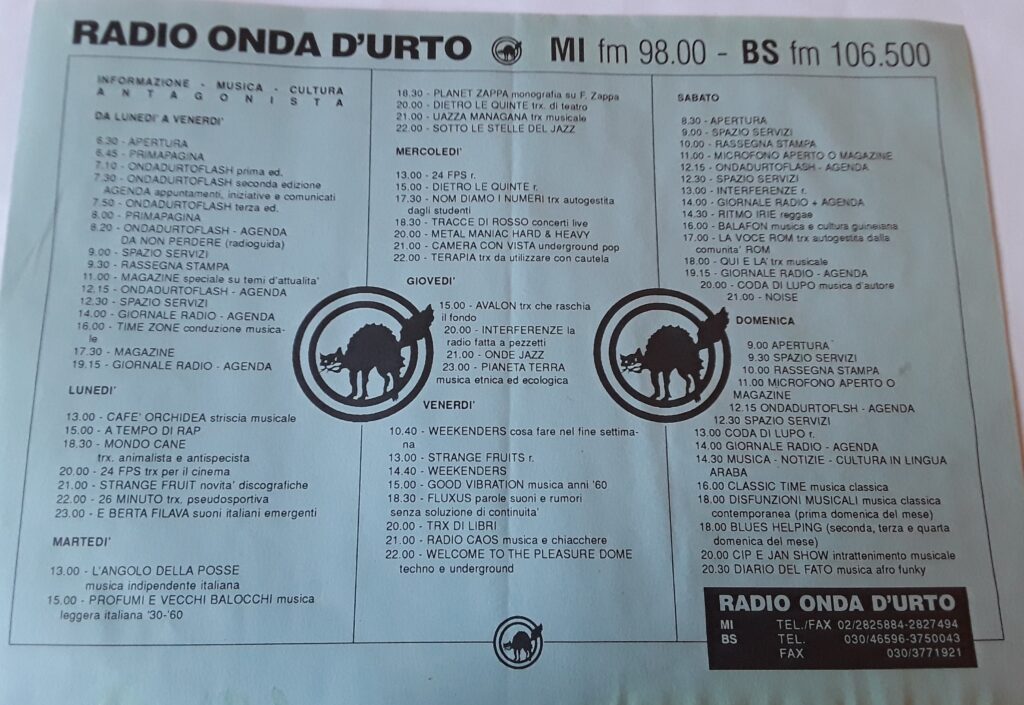 Senza precedenti esperienze o competenze radiofoniche si diede vita ad un palinsesto in permanente discussione e trasformazione. Intanto la nostra sfida alle leggi del profitto, che dominano anche l’etere, continuava vincente e chi pensava che una radio autogestita ed autofinanziata avesse vita breve dovette ricredersi. Con immani sforzi, sempre basandoci sull’autofinanziamento, migliorammo l’emissione del segnale radio, rinnovando anche gli studi di trasmissione e accogliendo nuovi collaboratori.