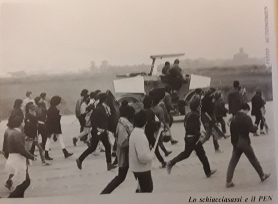 La marcia, il 24 marzo si svolge tra Crescentino e Trino, 15 km in una giornata assolata in mezzo a una distesa di risaie con 8.000 partecipanti. A dare manforte nei numeri al nostro spezzone concorrono decine e decine di compagni /e di altre città. A fine marcia al comizio conclusivo fischiamo rumorosamente l’intervento dell’esponente della Fgci in versione anti-nuke in un partito il Pci profondamente nuclearista, come si capisce bene dal manifesto appeso nel Vercellese dal Pci.