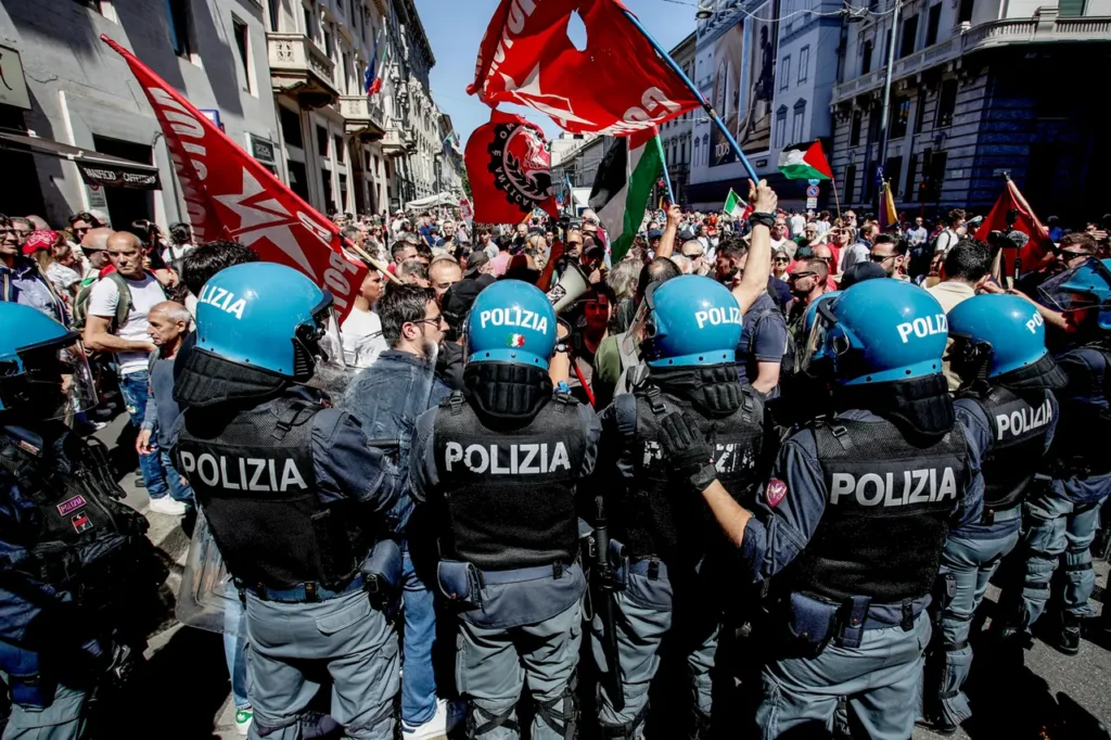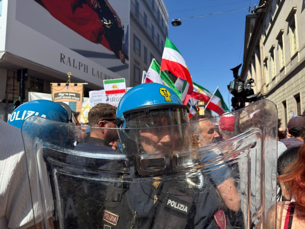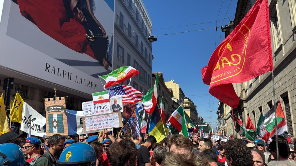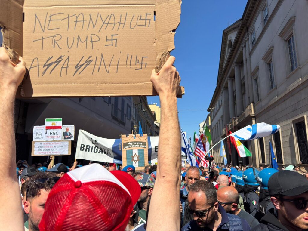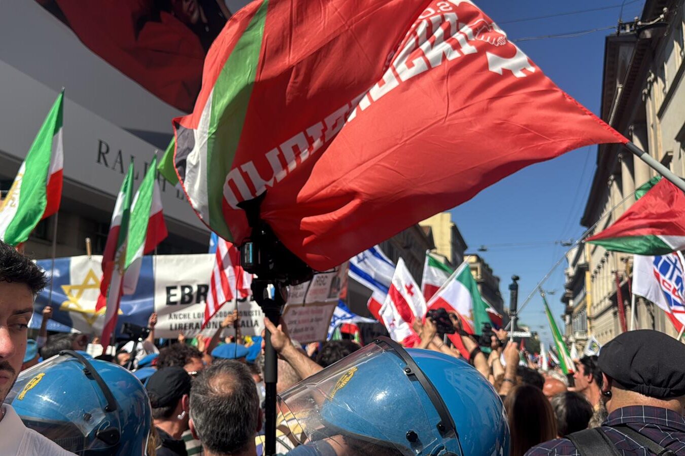 Nello spezzone sionista erano presenti, oltre alle bandiere dell’Ucraina, quelle dell’Iran dello Scià, cartelloni trumpiani, bandiere degli Stati Uniti, della NATO e addirittura di Forza Italia.