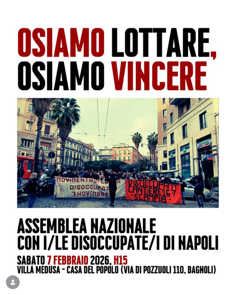 Ci vediamo a Villa Medusa. Sabato 7 Febbraio h 15:00 ricordando le tutte e tutti anche l’appuntamento del mattino al corteo cittadino alle 10:30 a Bagnoli contro l’abili del grande evento per rivendicare mare libero, spiaggia pubblica, lavoro stabile ed utile socialmente.