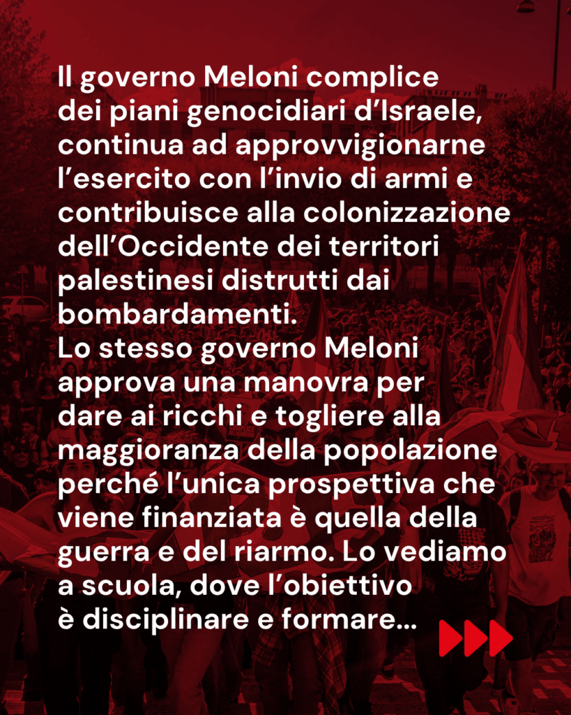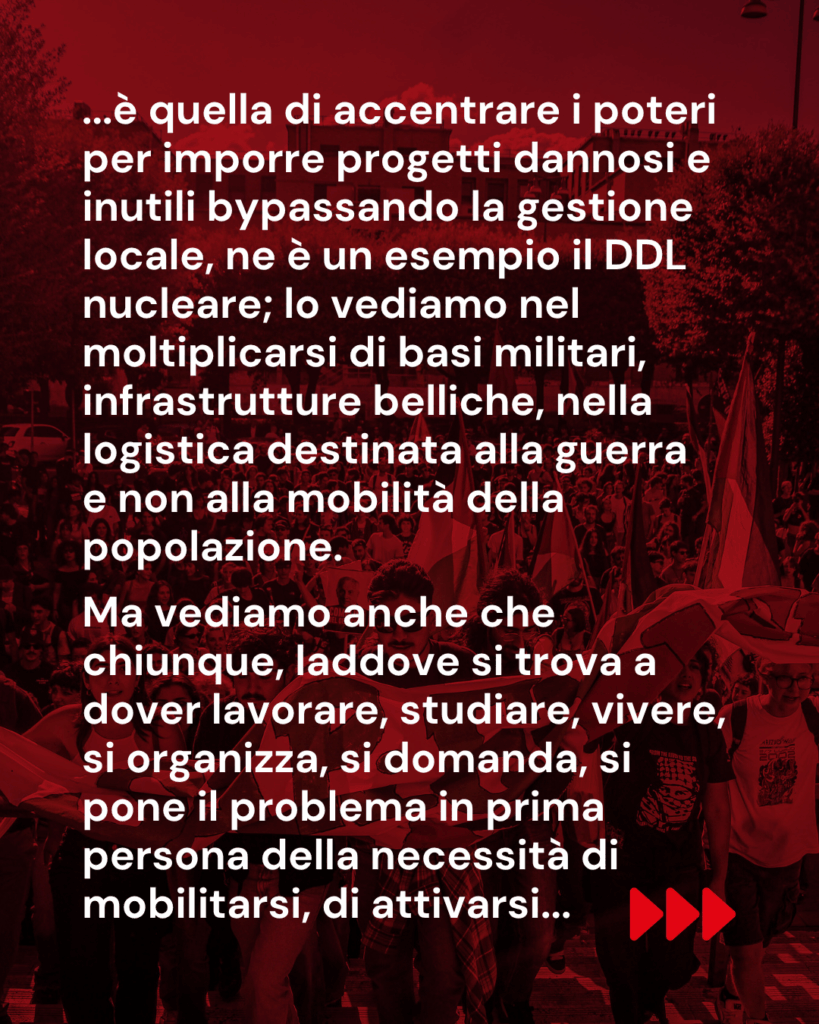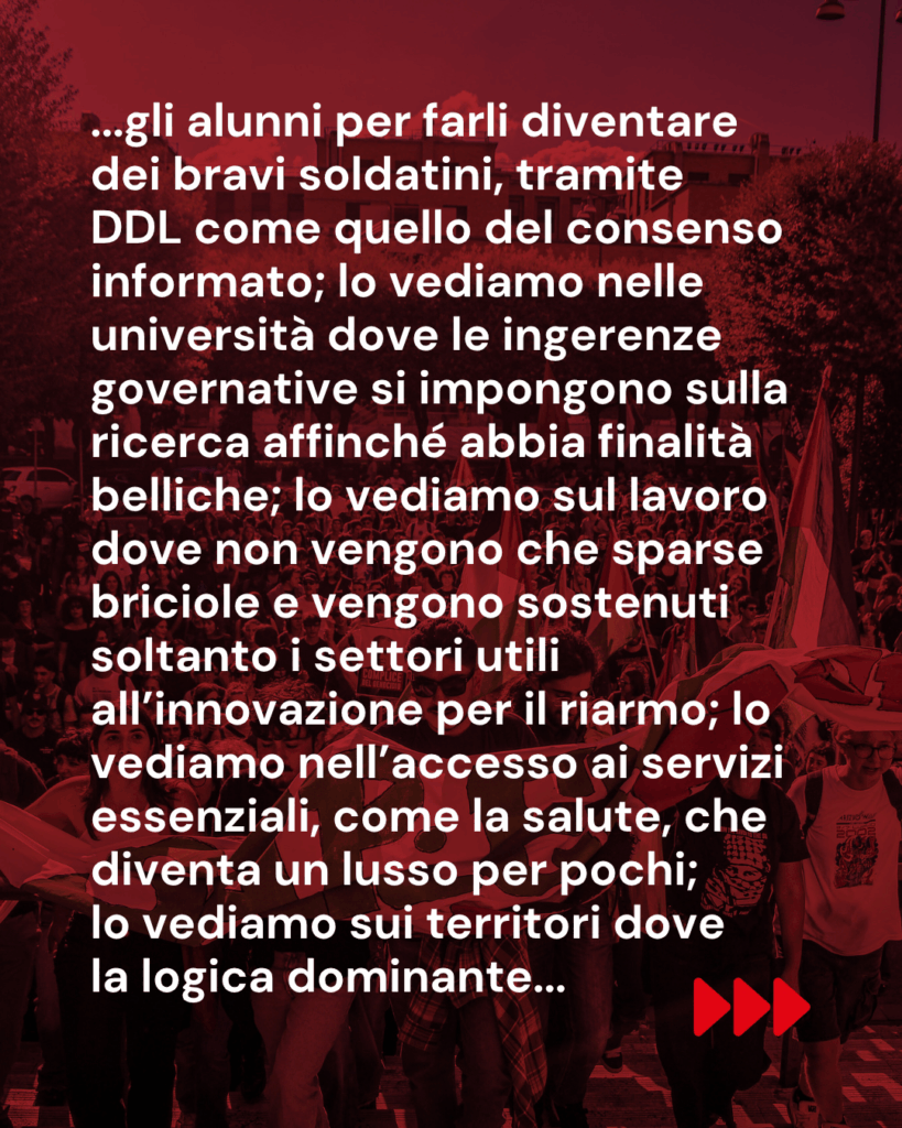 Lo stesso governo Meloni approva una manovra per dare ai ricchi e togliere alla maggioranza della popolazione perché l’unica prospettiva che viene finanziata è quella della guerra e del riarmo. Lo vediamo a scuola, dove l’obiettivo è disciplinare e formare gli alunni per farli diventare dei bravi soldatini, tramite ddl come quello del consenso informato; lo vediamo nelle università dove le ingerenze governative si impongono sulla ricerca affinché abbia finalità belliche; lo vediamo sul lavoro dove non vengono che sparse briciole e vengono sostenuti soltanto i settori utili all’innovazione per il riarmo; lo vediamo nell’accesso ai servizi essenziali, come la salute, che diventa un lusso per pochi; lo vediamo sui territori dove la logica dominante è quella di accentrare i poteri per imporre progetti dannosi e inutili bypassando la gestione locale, ne è un esempio il ddl nucleare; lo vediamo nel moltiplicarsi di basi militari, infrastrutture belliche, nella logistica destinata alla guerra e non alla mobilità della popolazione.
