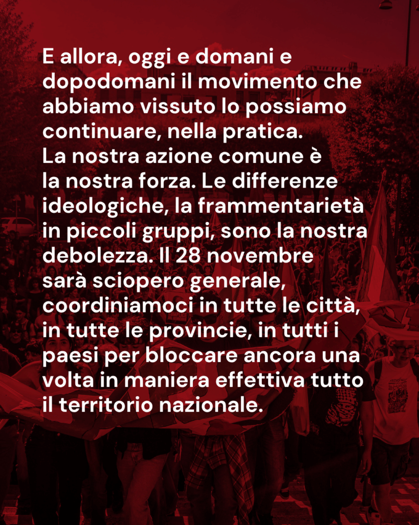 E allora, oggi, domani e dopodomani il movimento che abbiamo vissuto lo possiamo continuare, nella pratica. La nostra azione comune è la nostra forza. Le differenze ideologiche, la frammentarietà in piccoli gruppi, sono la nostra debolezza. Il 28 novembre sarà sciopero generale, coordiniamoci in tutte le città, in tutte le provincie, in tutti i paesi per bloccare ancora una volta in maniera effettiva tutto il territorio nazionale.