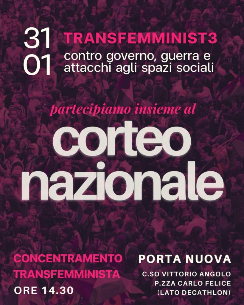 Il 31 gennaio puntiamo il dito contro Meloni e il suo governo. Rivendichiamo come nostre le strade e tutti spazi sociali che ci vengono tolti. Ripartiamo insieme per organizzare una lotta transfemminista al governo. Partecipiamo insieme al corteo, trovandoci alle H14.30 all’angolo tra corso Vittorio e piazza Carlo Felice (lato Decathlon).