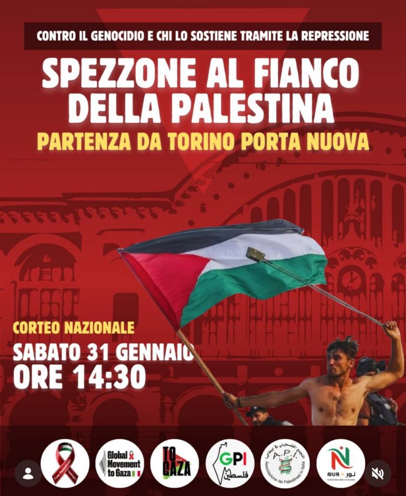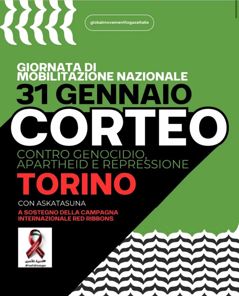 Sabato 31 gennaio, la lotta per la liberazione degli ostaggi palestinesi convergerà a Torino per sostenere i centri sociali italiani e la realtà di Askatasuna, riconoscendo la necessità di unire le lotte in difesa dei diritti umani, della libertà dei popoli e contro ogni forma di autoritarismo. Invitiamo i movimenti, le associazioni e la cittadinanza a unirsi al corteo di Torino; per chi fosse impossibilitato a partecipare fisicamente, esortiamo all’organizzazione di presidi e iniziative territoriali in tutta Italia, per sostenere con forza entrambe le cause, rivendicando libertà e diritti per tutte e tutti.