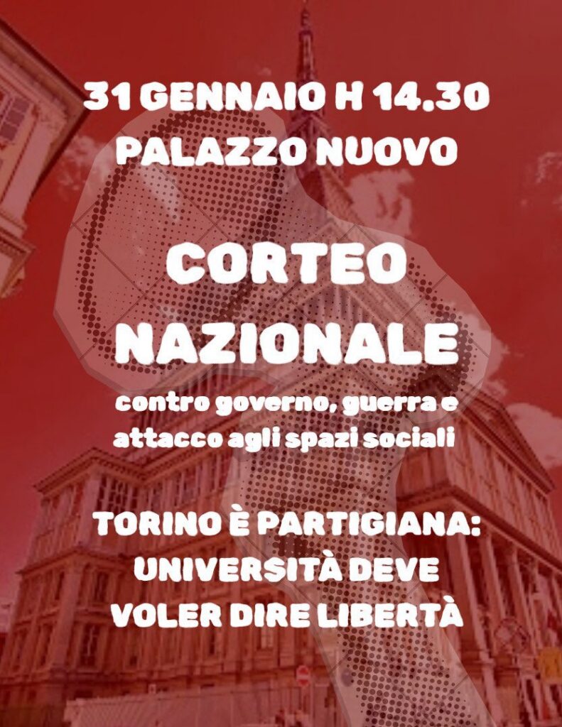 Come giovani e studentз saremo in piazza il 31 gennaio con uno spezzone universitario che partirà da Palazzo Nuovo, non solo per ribadire la nostra soliderietà allo sgombero del centro sociale Askatasuna ma anche per continuare a dare voce a tutto ciò che da mesi si mobilita nelle piazze italiane a fianco del popolo palestinese, contro genocidio, guerra e riarmo.