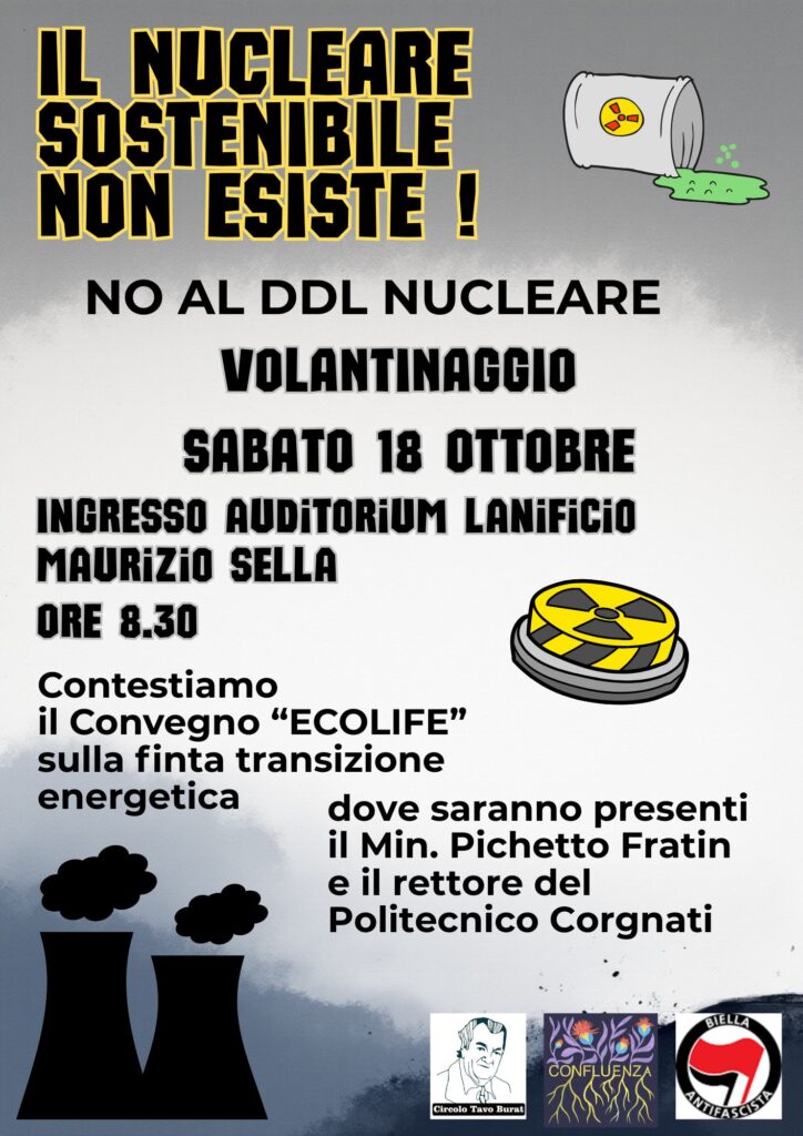 Sabato saremo presenti con i comitati del territorio come il Circolo Tavo Burat e il Coordinamento Antifascista di Biella per dare voce a un’altra lettura della realtà al di fuori della propaganda governativa in fatto di nucleare e rinnovabili.