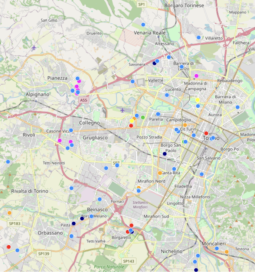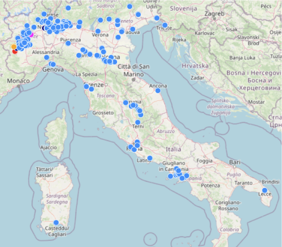 Zoomando all’indietro sulla mappa, siamo andati ad evidenziare una porzione di territorio più ampia, che oltre alla città di Torino include la zona ovest del canavese fino alla città di Ivrea (che segna il confine con la Valle d’Aosta). La parte settentrionale della provincia di Torino risulta puntinata di aziende di dimensioni medio-piccole, dedicate principalmente alla produzione di componenti per aziende più grandi o alla fornitura di lavorazioni meccaniche di precisione. Fanno eccezione le due sedi Leonardo presenti nell’aeroporto di Torino Caselle, corrispondenti alle divisioni Elettronica e Velivoli dell’azienda di corso Marche.