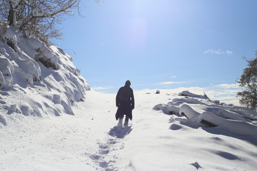 La seconda giornata si è svolta con una camminata sui luoghi della devastazione. Grazie alle persone che hanno a cuore il territorio e che quotidianamente monitorano l’avanzamento dei lavori abbiamo “attraversato i crinali innevati di Corella e Villore, immersi in un paesaggio suggestivo con il Monte Falterona sullo sfondo. Lungo il percorso è stato possibile osservare la deforestazione che interessa il Sentiero Italia, il Sentiero Europa E1 e la Grande Escursione Appenninica, insieme agli sbancamenti realizzati per trasformare la sentieristica in infrastruttura di servizio al trasporto dei componenti destinati all’impianto eolico industriale di Monte Giogo di Villore, area indicata come habitat dell’aquila reale. In prossimità del Sentiero 18 l’elicottero dei carabinieri ha sorvolato più volte la zona abbassandosi a un’altezza tale da sollevare nuvole di nevischio, senza tuttavia creare disagi ai partecipanti. La camminata si è conclusa al bivio tra il Muraglione e la Colla a causa dell’altezza della neve che impediva di proseguire in sicurezza.”
