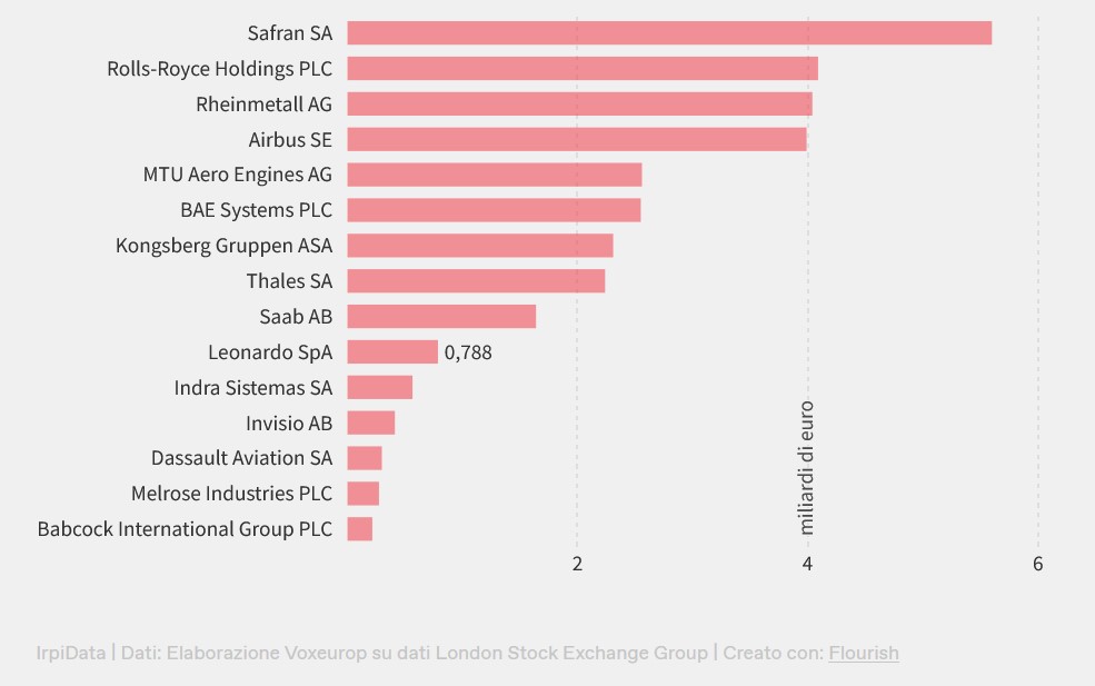 Tra le dieci società della difesa che attirano più investimenti verdi ci sono anche la tedesca MTU Aero Engines, l’italiana Leonardo, la filiale olandese di Airbus, la francese Thales, la spagnola Indra, la svedese Saab e le britanniche Rolls Royce e BAE Systems.
