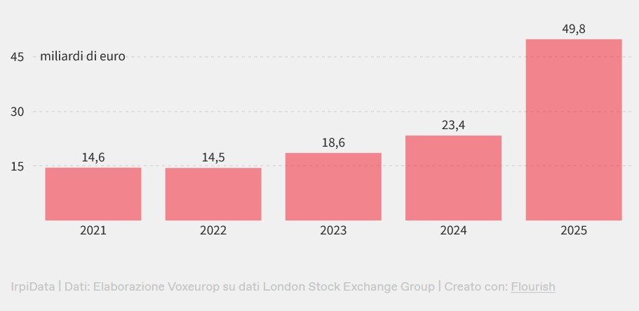 Da 14,5 miliardi di euro nel 2021 a 49,8 miliardi nel 2025. Tra il 2024 e il 2025 la quota di investimenti nel settore è raddoppiata, secondo dati che abbiamo estratto dalla London Stock Exchange Group, una piattaforma internazionale di dati finanziari.