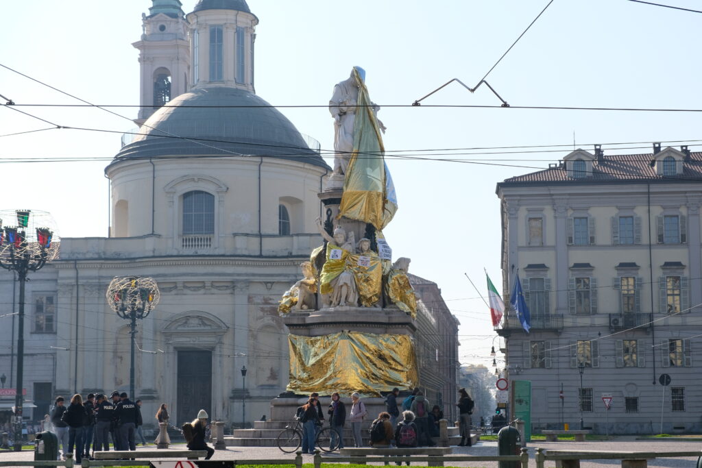 Torino: Extinction Rebellion ricopre di teli termici la Statua di Cavour in Piazza Carlina. “Tassare i ricchi, fermare il collasso climatico”.