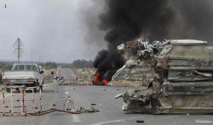 – Immagine di copertina e Foto 1: Rivolta contro la perforazione di un pozzo a beneficio di ”Délice”, filiale della multinazionale Danone. Jelma, regione di Sidi Bouzid, maggio 2018. Foto: E.O.P.