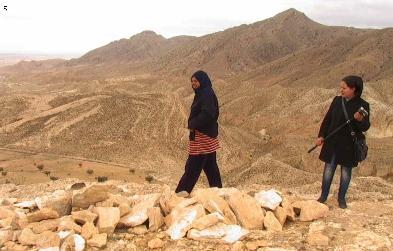 – Foto 5 Messaouda Hajlaoui, una contadina della regione di Gtrana (Sidi Bouzid), con Hayet al momento delle riprese, nel Djebel Sidi Khelif