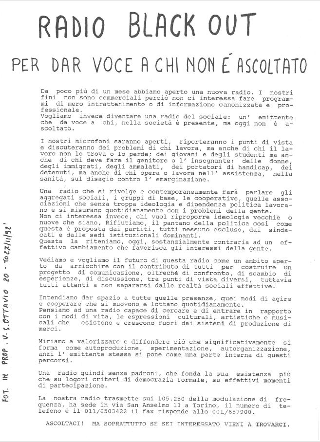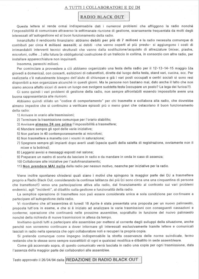 Sfoglia “Radio Black Out – Fascicolo dibattito interno 1993/1995” e “Incontro radio antagoniste – 19 febbraio 1995“: