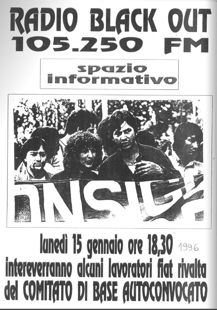Radio Black Out nasce su iniziativa del Centro Sociale dei Murazzi che aveva impegnato molte energie in questo progetto. Subito furono coinvolti anche gli altri Centro Sociali o case occupate delle città e i ragazzi che attorno a essi ruotavano. Problemi di coordinamento e di gestione erano e sono all’ordine del giorno. “Io la vedrei come un’orchestra in cui ognuno suona uno strumento diverso. La sinfonia però è la medesima. Oggi a Radio Black Out non è così. Essere aperti a tutti ha anche voluto dire mettere insieme le due anime forse inconciliabili cioè, semplificando, quella anarchica e quella comunista. In realtà oggi si è perso gran parte del peso ideologico di sapore ottocentesco in questo confronto. Gli anarchici che fanno riferimento a El Paso, Barocchio e Prinz Eugen, sentono più forte il senso della trasgressione, della provocazione e in una certa forma si autoghettizzano. Il Gabrio e i Murazzi, pur con differenze tra loro, sono invece i due centri sociali che risentono di più della tradizione comunista.