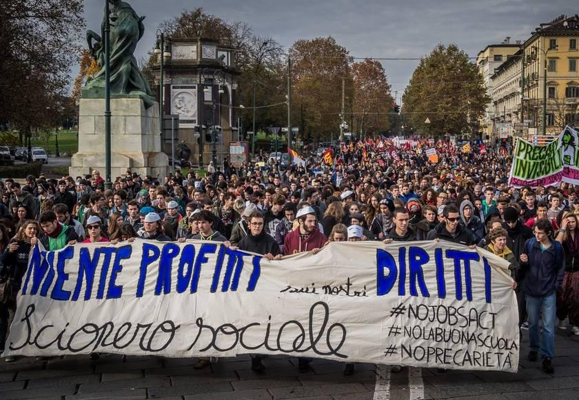 Diretta dalle piazze italiane dello sciopero sociale e metropolitano Non sappiamo se Renzi ha scelto esplicitamente la giornata di oggi per annunciare i tempi accelerati per l’approvazione definitiva del Jobs Act (domani mattina seduta dedicata all’ammissibilità degli emendamenti al ddl delega, domenica pomeriggio il voto),quello che è certo è che le piazze di tutte le […]